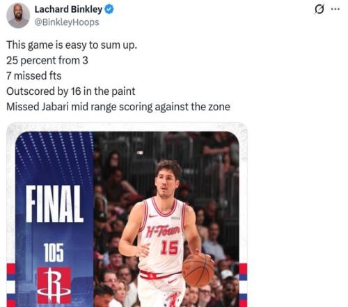 在37岁杜兰特持续交出傲人表现的情况下,火箭队之所以还输掉比赛,火箭队记Lachard Binkley也第一时间总结出4大扎眼问题。