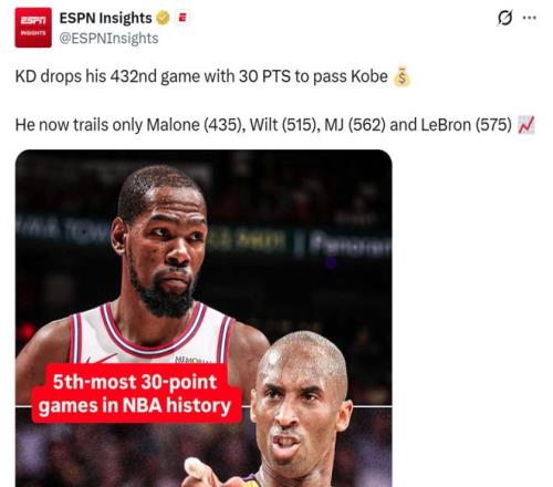 凭借这样的表现,杜兰特常规赛已经第432次拿到30+,成功超越科比独占NBA历史第五,仅次于詹姆斯(575)、乔丹(562)、张伯伦(515)和卡尔·马龙(435)。