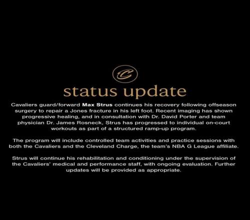 接下来他将逐渐开始与球队合练,可能在骑士和下属发展联盟球队进行训练。斯特鲁斯将在医疗和训练团队的监督下继续进行康复训练,后续将跟进其动态。