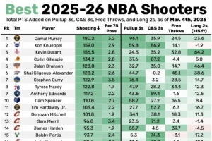 本赛季最准30人:穆雷断层领跑 杜库卡华亚登&谢泼德肯纳德上榜