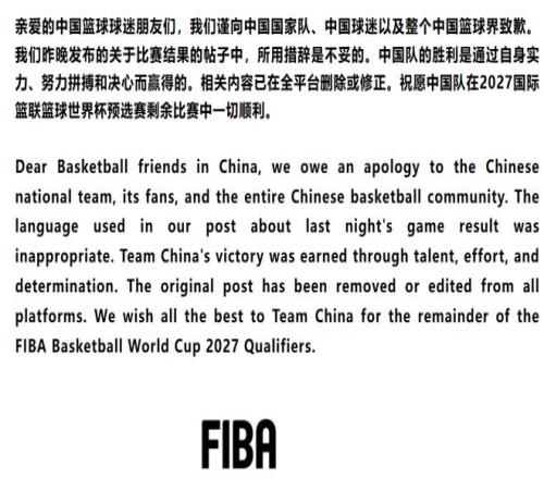 FIBA官方账号发文称中国男篮偷走胜利,国际篮联次日就此公开道歉