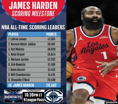 北京时间1月13日,快船对阵黄蜂,哈登常规赛生涯总分超过奥尼尔(28596分),升至NBA历史得分榜第9位,继续书写他作为联盟顶级得分手的传奇生涯。在现役球员中,哈登的得分仅次于詹姆斯(42601分,截至今日比赛前)和杜兰特(31458分)。