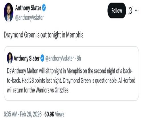除此之外,追梦也在赛前突然因伤缺席,勇士随队记者Anthony Slater给出的原因是左下背部伤病管理。