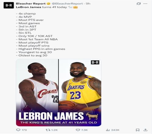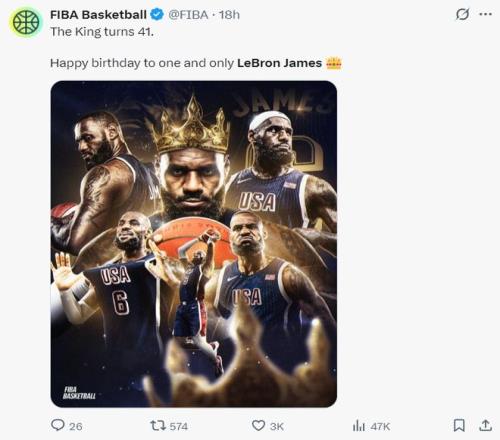 就连FIBA官方都为老詹送上41岁生日的祝福。