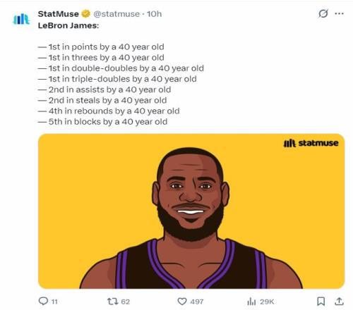 数据StatMuse媒体写道:40岁后得分第一,40岁后三分球第一、40岁后两双第一、40岁后三双第一、40岁后助攻第二、40岁后抢断第二、40岁后篮板第四、40岁后盖帽第五。