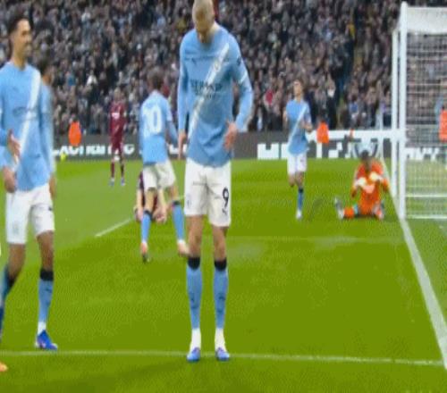 比赛开始仅仅5分钟,福登突入禁区之后横传,哈兰德左脚扫射被门将挡出,哈兰德补射破门,1比0!进球之后,哈兰德与赖因德斯、切尔基一起跳起了机械舞庆祝。