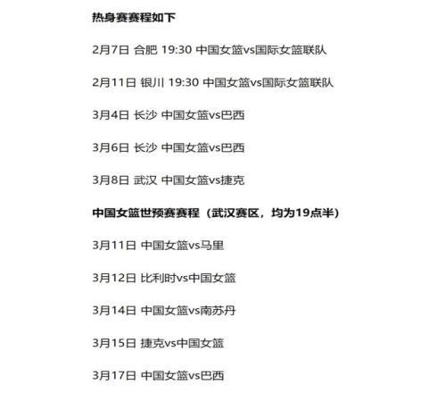 明晚和国际联队的比赛之后,中国女篮国家队将得到短暂的休息,春节假期。然后到了3月开始,中国队将在长沙和巴西队打2场热身赛,在武汉和捷克打1场热身赛。等到3月11日开始,中国女篮就将开启世界杯资格赛之旅。