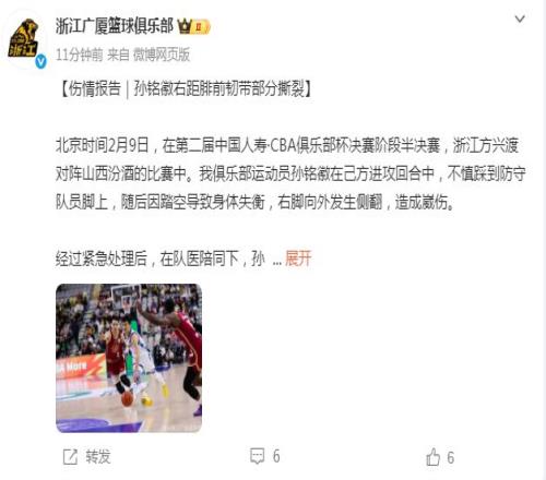 在CBA俱乐部半决赛广厦59-78惨负山西的比赛当中,广厦核心孙铭徽在进攻回合中,不慎踩到防守队员脚上,随后因踏空导致身体失衡,右脚向外发生侧翻造成崴脚受伤。
