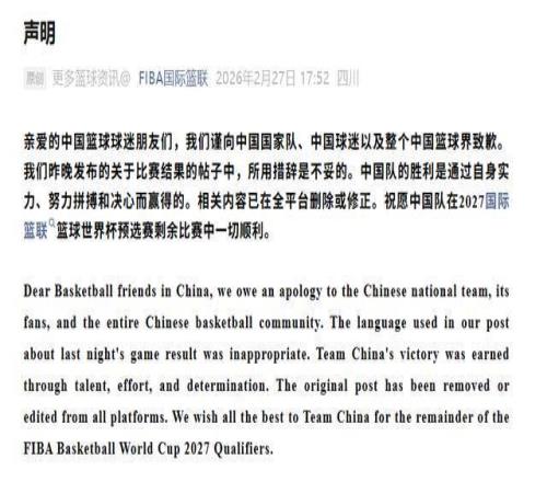 相关内容已在全平台删除或修正。祝愿中国队在2027国际篮联篮球世界杯预选赛剩余比赛中一切顺利。