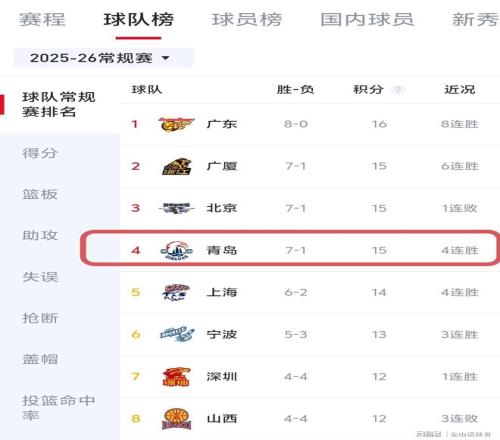 截止CBA常规赛前8轮,青岛队以1负7胜的战绩,排在积分榜第4位。与上届总决赛冠亚军广厦、北京队,战绩相同、并驾齐驱。