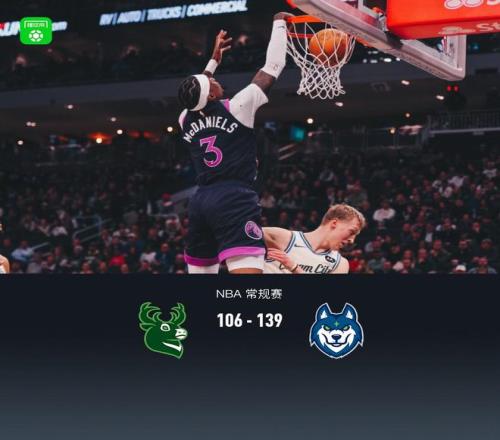 北京时间1月14日NBA 常规赛,密尔沃基雄鹿对阵明尼苏达森林狼。半场雄鹿45-76森林狼,最终雄鹿106-139森林狼。