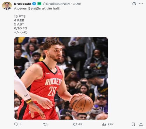 在火箭三连客吞下三连败后,杜兰特、申京两人都遭到了诸多的批判,不少的火箭球迷将球队的低迷归罪于这两位核心。火箭记者Bradeaux晒出杜兰特本赛季场均26.1+5.3+4.5+0.6+1的数据、申京场均21.7+9+6.4+1.5+1的数据力挺两人。