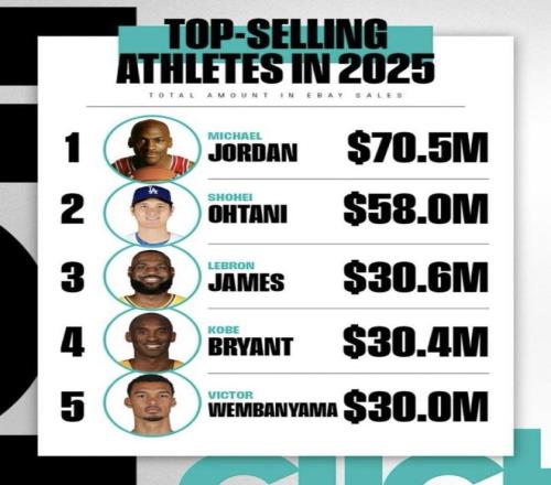 最近eBay发布了“2025年eBay销售总额最高的运动员”榜单,乔丹、詹姆斯、科比等人都在榜上,大谷翔平也挤进了前二。更夸张的是,科比离开赛场已经多年,2025年相关商品在平台上依然能卖到3040万美元,这股购买力到底从哪来?同一份榜单里,62岁的乔丹还能稳坐第一,21岁的文班亚马又已经冲到第五,这种“跨代同框”的排名,谁的位置最让人意外?(数据截至2025年)