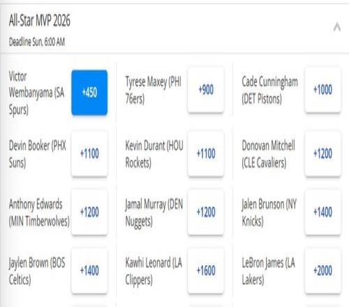 北京时间2月12日,2026年全明星赛进入倒计时,本次全明星采用美国队vs世界队的新赛制。谁将成为这次全明星的MVP?最新赔率显示,文班亚马断层领跑,是最被看好的球星。杜兰特排名第4,詹姆斯位居第12。