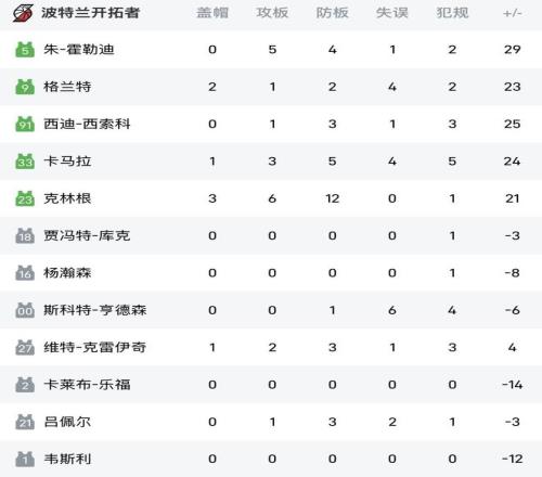 本场比赛,开拓者首发阵容与替补阵容出现严重脱节,在大胜爵士16分的情况下,开拓者首发5人正负值均为+20以上,替补席仅有新援克雷伊奇的正负值是正的,其余6人正负值均为负。