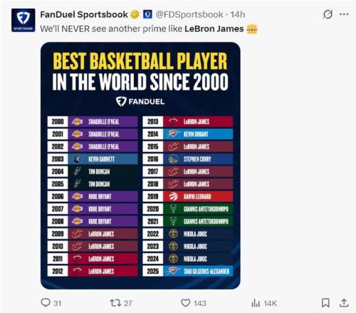 美媒FanDuel晒出了自2000年后联盟最出色的球员,2000-2002年奥尼尔、2003年加内特、2004-2005年邓肯,2006-2008年科比,2009-2013年詹姆斯,2014年杜兰特,2015年詹姆斯,2016年库里,2017-2018年詹姆斯,2019年伦纳德,2020-2021年扬尼斯,2022-2024年约基奇,2025年SGA。詹姆斯一人有八次,美媒写道:我们再也不会见到勒布朗这个级别的球员了。