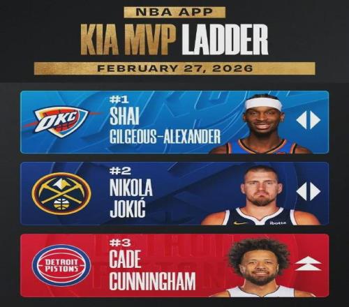 NBA官网公布的最新一期MVP排行榜显示,亚历山大继续高居榜首,约基奇紧随其后,坎宁安位列第三,文班亚马第四,东契奇第五,杰伦布朗第六,米切尔第七,布伦森第八,爱德华兹第九,伦纳德第十。