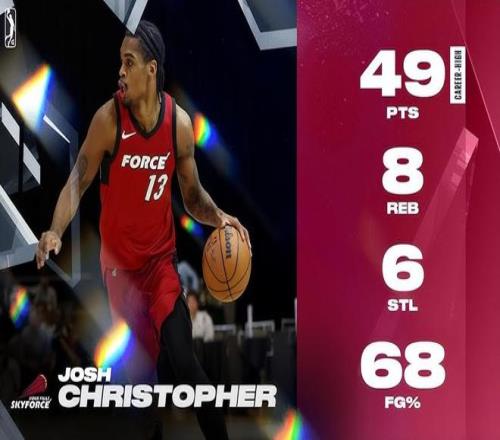 本场比赛中,苏福克斯天力的先发后场球员约什-克里斯托弗(Josh Christopher)全场出场43分钟,投篮28中19,三分线外9中4,罚球4中4,得到了全场最高分49分外加8篮板4助攻6抢断的全面数据,还有4次失误和2次犯规,正负值也是达到了+20。值得一提的是,49分也是克里斯托弗在NBA发展联盟赛场上的单场得分新高。克里斯托弗在进攻端不断通过突破和冲击完成得分,他也给对手内线制造了不小的威胁。不仅如此,克里斯托弗在外线投篮方面的表现也是非常突出的,他也是通过了各种方式拿下了大量的分数,对手也根本没有办法对他进行基本的限制。除此之外,克里斯托弗在防守端的表现也是可圈可点的水平,同样是起到了关键的作用,展现出了自己超强的防守能力。克里斯托弗在本场比赛中算是打出了攻守兼备的顶级表现,这也为球队的这场胜利做出了巨大的贡献。