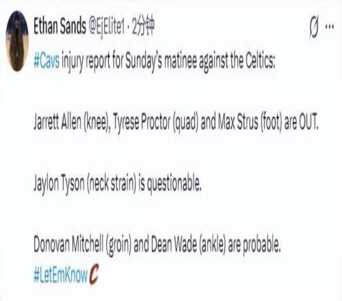 采访结束后不久,骑士官方更新了明日对阵凯尔特人的伤病名单——