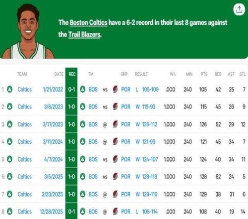 上一次开拓者击败凯尔特人还要追溯到2022年1月21日,在那场比赛中开拓者以109-105击败了对手,而在那场比赛中,目前效力于凯尔特人的安芬尼-西蒙斯(21分)还在开拓者,努尔基奇(29分)和CJ-麦科勒姆(24分)是获胜的最大功臣。