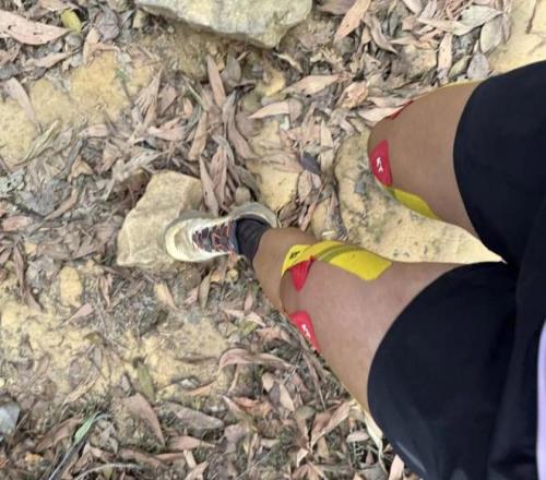 7KM左右出现第一个挑战,一个陡峭的坡,大概有这么“\”陡吧。我前面的女生一个没踩稳直接滑倒,还好我夏天时沉迷举铁,一下子就把她拉了起来。姐妹们,练力量真的有用啊。当然,越野跑时候更重要的还是要穿一双抓地力强的跑山鞋——凯乐石FUGA EX3。