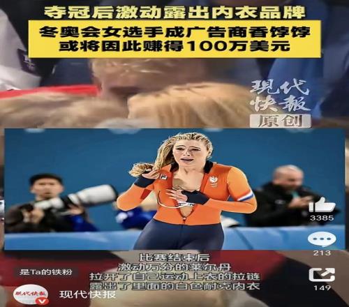 莱尔丹在冬奥会女子1000米速滑决赛中,不仅以打破奥运纪录的成绩摘金,还在本届赛事拿下一金一银的亮眼成绩。有意思的是,在夺冠瞬间,她激动地拉开国家队赞助商FILA的橙色紧身服拉链,露出了醒目的白色Nike运动内衣,这一瞬间被镜头捕捉后迅速走红全球。