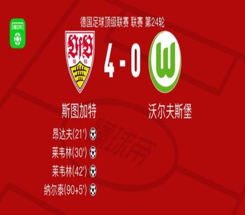 北京时间3月1日德国足球顶级联赛 联赛 第24轮,斯图加特主场对阵沃尔夫斯堡。斯图加特昂达夫破门,莱韦林梅开二度,纳尔泰破门。最终比分斯图加特 4-0 沃尔夫斯堡。