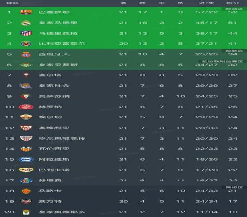 埃尔切、塞维利亚和毕尔巴鄂竞技都是24分暂列第11-13名,瓦伦西亚以23分暂列第14名。阿拉维斯、巴列卡诺和赫塔费都是22分暂列第15-17名。马略卡21分、莱万特17分、皇家奥维耶多13分排在倒数后三名,其中莱万特和皇家奥维耶多的积分还没有超过20分,保级压力非常大!