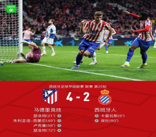 北京时间2月22日西班牙足球甲级联赛 联赛 第25轮,马德里竞技主场对阵西班牙人。上半场,卡雷拉斯破门,瑟洛特扳平比分。下半场,巴埃纳助攻,小西蒙尼帮助马竞反超比分。鲁杰里随后送出两次助攻,卢克曼和瑟洛特相继破门。埃杜远射得分,为客队扳回一城。全场比赛结束,马竞4-2击败西班牙人。