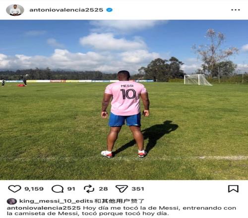 1月22日。有曼联名宿安东尼奥·瓦伦西亚近日发动态,晒出他穿迈阿密国际10号、梅西球衣的照片,场景是在训练。瓦伦西亚的配文是:终于轮到我了!今天轮到我了,轮到穿梅西的球衣训练了,轮到就是轮到,没商量。