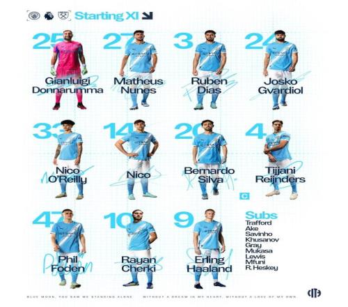 曼城首发:25-多纳鲁马、27-马特乌斯-努内斯、3-鲁本-迪亚斯、24-格瓦迪奥尔、33-尼科-奥赖利、14-尼科-冈萨雷斯、20-伯纳多-席尔瓦、4-赖因德斯、47-福登、10-谢尔基、9-哈兰德