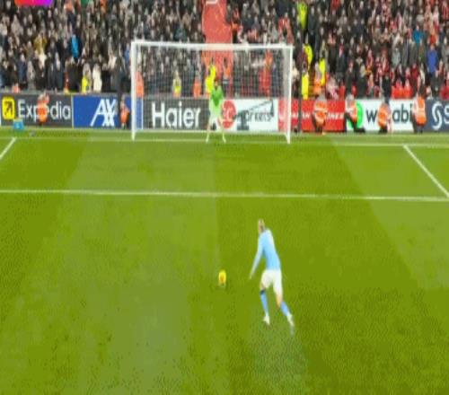 第91分钟,阿利森撞倒努内斯,主裁判判罚点球,哈兰德主罚点球一蹴而就,2比1!进球之后,哈兰德脱掉球衣疯狂庆祝。