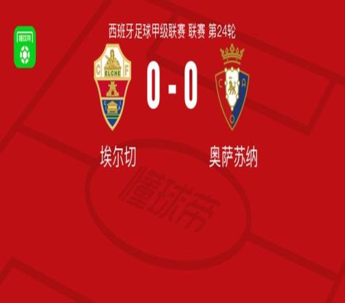 北京时间2月14日西班牙足球甲级联赛 联赛 第24轮,埃尔切主场对阵奥萨苏纳。最终比分埃尔切 0-0 奥萨苏纳。