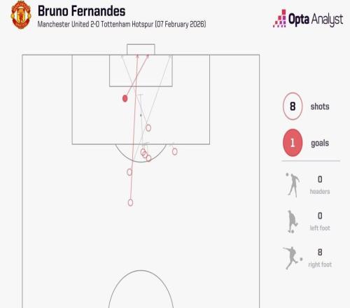 英超第25轮,曼联主场2-0击败热刺,本场比赛曼联队长布鲁诺-费尔南德斯参与了14次射门,这是自2024年10月的萨卡以...